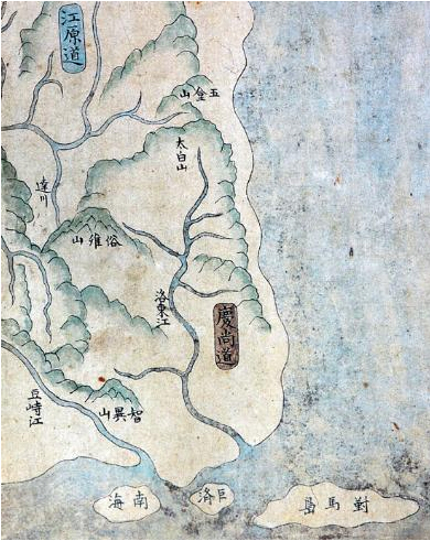 1756年日本地理学者 Morigoan(森幸安) 製作(日本地理学者 製作)  対馬与地図 (大麻余地も). 江戸時代(江戸時代) , Kyoto Kitano denmanku(北野天満宮) 保管. 2003年, 森幸安地図(森考案地図)にまた収録.