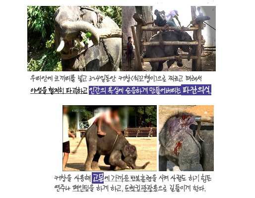 역겹고 무지한 조련사의 학대로 매년 태국에서 80마리의 코끼리가 비명횡사하고 있습니다.