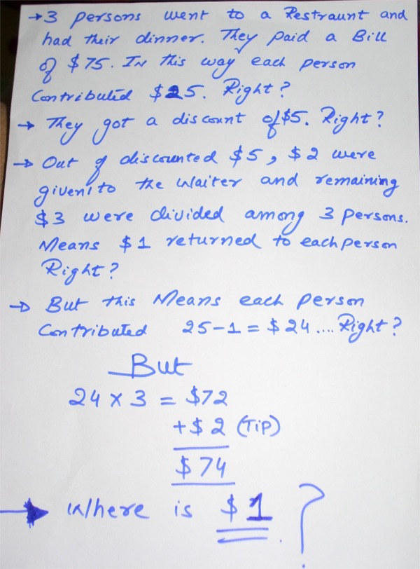 ·레지에서 5 달러의 할인이 있었으므로, 2 달러를 팁으로 해, 남은 3 달러를 3명이서 나누었습니다.