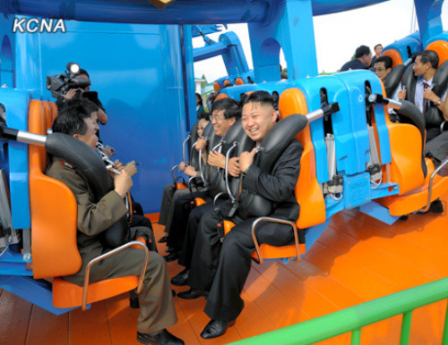 完工したばかりの綾羅人民遊園地で遊具に満面の笑みで乗る金正恩第1書記