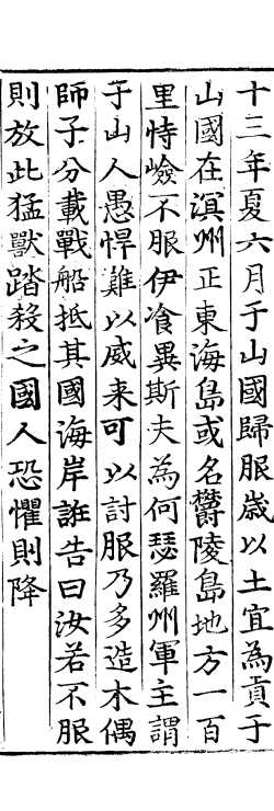 十¥三年(512年)夏六月、于山国を服属し毎年土地の産物を貢いだ。于山国は溟州のちょうど東の海の島にあり、別名を鬱陵島という。外周は百里ほどで、渡航が困難なことを恃みにして服従しなかった。何瑟羅州の軍主となった伊飡の異斯夫が言うには、于山人は愚かで凶暴¥である。威嚇するのは難しいが計略をもってすれば服従させることができる。そこで木製の獅子の像を多く造り戦艦に分けて載せその国の海岸に着くと、誑かして「お前たちがもし服属しなければ、すぐにこの猛獣を放ち踏み殺させるぞ。」と告げると、于山国人は恐れ慄きすぐに降伏した。