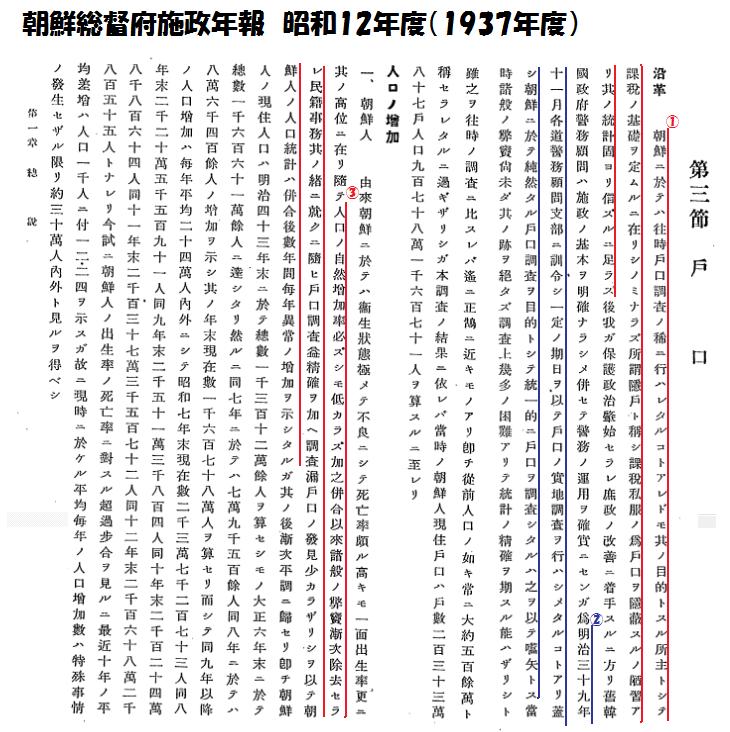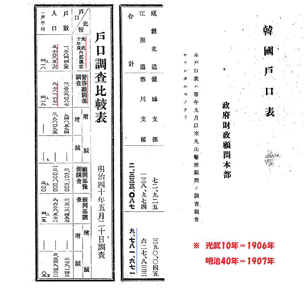 우의 붉은 선의 기술을 요약하면 「병합 이전에 이조 조선도 인구조사를 하고 있었지만, 세금을 징수하기 위한 조사였으므로, 모두 정직하게 신고 하지 않았다」라고 하는 일이 써 있습니다.