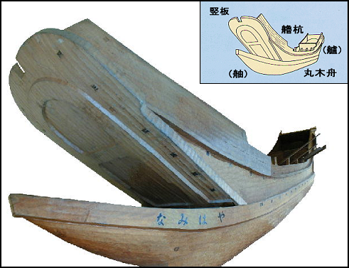 古代の船と言えば単純に木をくりぬいた丸木船ですが、こちらはその丸木船の上に板を組みつけたものです。