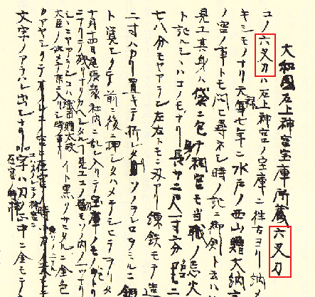 七支刀を発見し、最初にその銘文の解読を試みた石上神宮の宮司は、これを「六叉刀」と書き残しているわね。