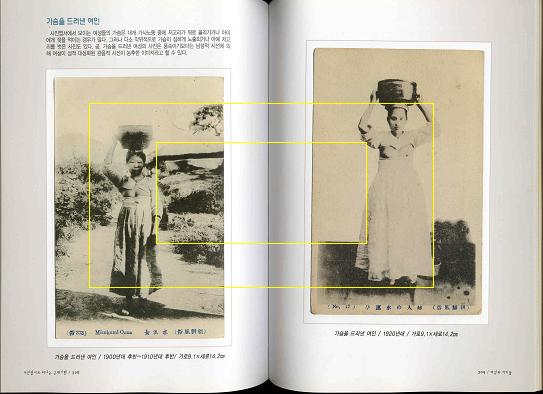 1883년경 조선을 방문했던 퍼시벌 로웰(Percival Lowell) 역시 "저고리와 치마 사이에 틈이 벌어져 가슴이 약간 노출되는 경우도 있지만, 이런 일은 우물가에서 물을 길어 머리에 인 평민 계층에서나 볼 수 있는 우연일 뿐이다"라고 말했다. 가사노동을 하거나 아이에게 젖을 줄 때나 보였던 여성의 가슴을 원시적이고 미개한 풍속으로 만들어 확대재생산한 것이 바로 일제의 사진엽서였던 것이다.