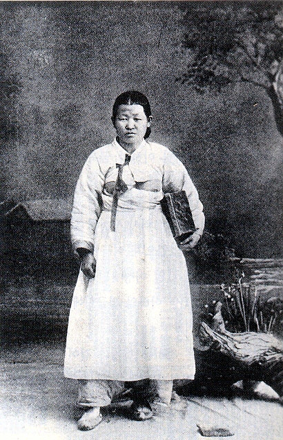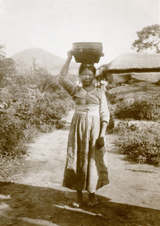 여성의복으로는 매우 짧은 저고리에 풍성한 속곳과 속치마가 있다. 속치마는 서구 여성의 것과 비슷한 형태에 기다란 치마끈이 달려 있다. 이 끈은 인간의 신체 구조를 무시한 채, 치마를 될 수 있는 한 높이 올려 묶게 만든다. 하지만 그럼에도 불구하고, 저고리와 치마 말기 사이에는 종종 2내지 3인치 가량의 틈이 벌어져 유방이 약간 노출되는 경우도 생긴다. 한 가지 반드시 덧붙일 말은 이런 뜻하지 않은 일은 우물가에서 물을 길어 머리에 인 평민 계층에서나 볼 수 있는 우연일 뿐이다.