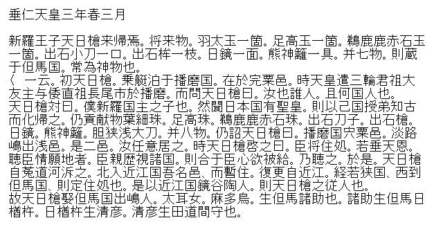 朝鮮物語には垂仁天皇三年と書いてありますので、日本書記の垂仁天皇三年の記述を読んでみましょう。