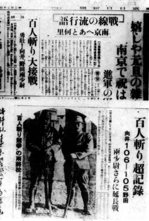 2次大戦当時日本軍は余分の士気を高めるために民間人である白人虐殺を競争的にけしかけた. 新聞はこのような殺人競争をインタビューしてその勝者を報道した. そういうインタビューは殺人者を誇らしい行為を一人物に操作したし, 彼らの勇気は記録されて広く知られた. このような暴悪な殺人競争中一つを南京の資金山岸で捜してみることができるし, これに対する記録は主要新聞に載せられて全世界に報道された. この野蛮的で残忍な行為は常人の想像を越すのだった. 下のような事実で南京を攻撃して占領した頃ズルング(南京外郭都市)に駐屯していたカタギリ派遣部隊には二名の将校があった. 彼らの名前は無カイ都市あき, Nodaダケシだった. が二人の下級将校は彼らに勇将(勇気ある長寿)というホチングウルバッウムとして 一番強い さむらい精神 持ち主というのをナタネンデに自負心を感じていた. 彼らの上官は励ましたし殺人沙ざを許可してくれた. 誰が先に南京を占領する前に 100人を殺して光栄を占めること人家というのが競争の目標だった. 彼らは Tang山に到着した時 無カイ都市あきは 89人を, 掻ダダするようにの時は 78人を殺した. 彼らの目標である 100人は失敗したが競争は止めなかった. たとえ2枚校皆目標を満たすことができなかったが彼らの上官は彼らの苦労を忘れなかった. 上官は何回も励まして褒賞したし彼らの奮闘を裏付けた. 大阪の毎日新聞と東京のニッチニッチ新聞と日本広告だ (英語版)はこの殺人競争を記事化した. 無カイ都市あきと掻ダダするようにの時はここで止めなかった. 彼らの名誉が下がることを願わなかったし, 南京陷落の後資金山岸で二名の将校は競争をずっと引き続いた. もう無カイ都市あきは 106人をドダダケシは 105人を殺したが誰が先に 100人を記録したのか分からなかった. 二つとも目標は越したが誰が先に果たしたのか分かる方法がなかった. しかし彼らはこの競争を ¥”親善ゲーム¥”と思ったし, 無カイ都市あきは ¥”面白いの¥”と言った. その時点で勝者を選り分けることができないと2枚校は 150ミョングウロモックピョを変えるとか 1000人を目標にするクンギェフェックを思った. 計画を修正した後2枚校は競争での楽しみを続いて感じた.