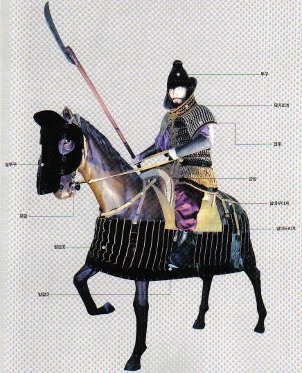 철갑으로 무장한 개마무사, 미늘로 말과 무사의 갑옷을 만들어 완전 무장했다.