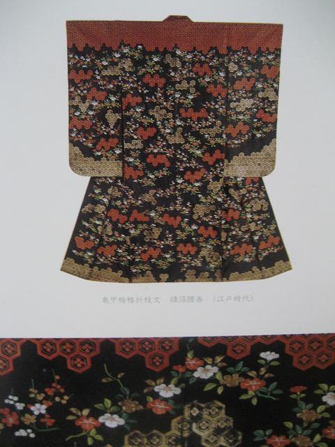 [8]  濃き色の表着(うわぎ)を着る。内着類の最上衣である表着は錦織物で作られ、地紋様と共に華麗な色糸で上文を織り表した二陪(ふたえ)織物が用いられる。表着を含めて装束の色目が美しく配されるように、衣裳は上になる程小さく作られている。