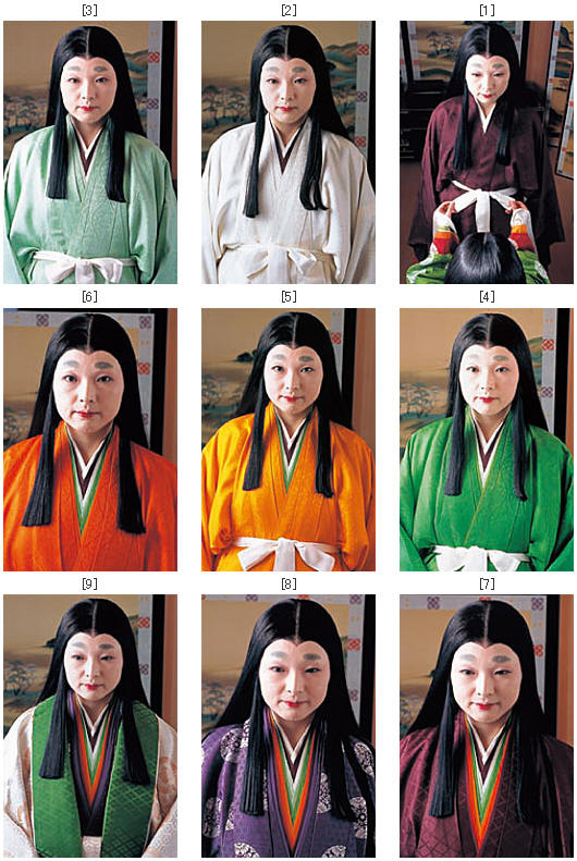 [9]  最後に唐衣(からぎぬ)を着て、裳(も)をつける。襟に帖紙(たとうし)を挟んで手に衵(あこめ)扇(おおぎ)(檜ひ扇おおぎ)を持つ。袿の襟は一枚づつ打ち合わせて着るのが正装だが、五枚を一重ねにして着る単重ねの襟が略装として行われた。