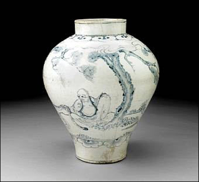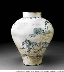 2008년 미국에서 418만4천달러에 팔린 백자입니다.한 선인(仙人)이 소나무 밑에서 호랑이의 엉덩이 부분을 잡고 있고 호랑이는 이에 화가 난 듯 선인을 노려보는 그림이 민화풍(民畵風)으로 그려져 있습니다.19세기 미국 보스턴 사교계의 명사 그레첸 워렌의 후손이 소유하던 것이랍니다.
