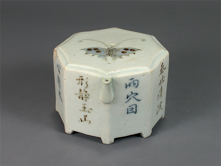 宝物 1458号バックザチォングファチォルファゾブムンシミョングパルガックヨンゾック(白磁青華鉄画蝶文詩銘八角硯滴)です.18世紀作品.恋敵に書かれた七言絶句(七言絶句)の時は次の通りです.