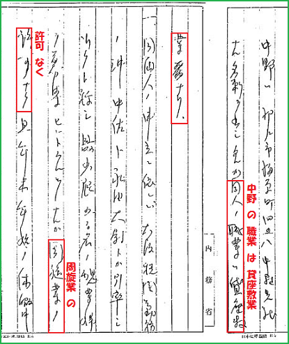 ここで問題にされたのは「中野(Nakano)」に周旋業の許可がなかったことです。周旋業とは、不動産売買や雇い人の口入れ、見合いの仲介などの斡旋をする仕事です。