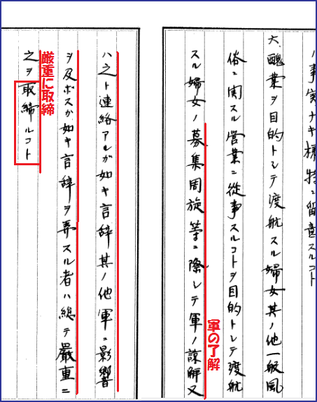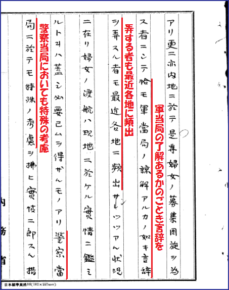 文書には慰安婦の募集に際して、まるで「軍当局の了解」があるかのように説明している業者が各地に現われていると書かれています(右の赤い線)。警察はこれを憂慮すべき事態と見ているわけですが、その一方で慰安婦の渡航については軍の実情にも配慮して「特殊の考慮」が必要だと考えています(左の赤い線)。