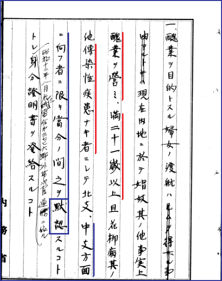 그 취급에 대해서, 제일 단락에서는 잘라 기술되어 있습니다.위안부에 대해 「경험자」 「21세 이상」 「병없음」의 3조건을 채우면, 중국에 도항하는 것을 「묵인」하고, 신분 증명서를 발급해도 괜찮은 일로 여겨졌습니다.