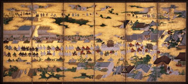 聚楽第屏風。聚楽第を出る豊臣秀吉の行列=上越市立総合博物館提供
