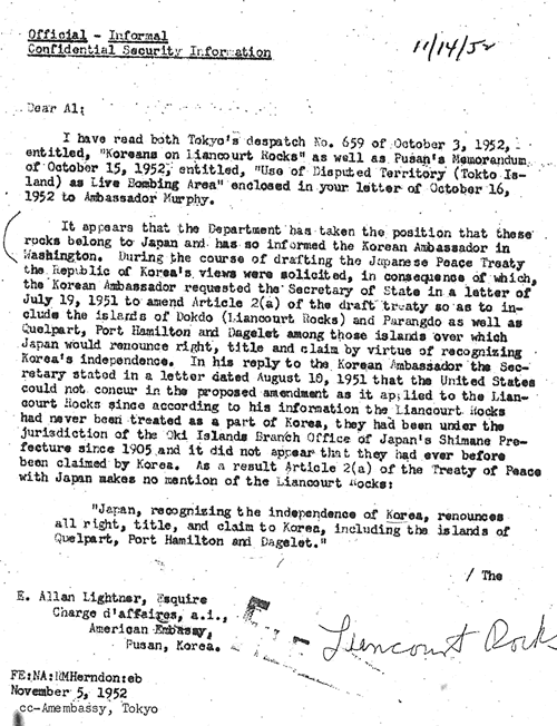 도쿄의 「리안크르바위에 한국인」이라고 제목을 붙이는 1952년 10월 3 날짜 전달서 659호 및 머피 대사당 1952년 10월 16 날짜 초간에 첨부된 부산의 「영유권이 싸워지고 있는 영토(독도)의 실사 훈련장으로서의 사용」이라고 제목을 붙이는 1952년 10월 15 날짜 각서를 읽었습니다.