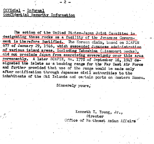 それゆえ日米合同委員会によるこの島の日本政府としての指定は正当化できます。竹島(リアンクール岩)を含む種々の島嶼地域に対する日本の施策を「停止した」(Suspended)1946年1月29日のSCAPIN677に基づく領土主張を韓国はしていますが、これによって日本がこの地域に永続的に主権を行使することが排除されることはありませんでした。後続のSCAPINである1947年9月16日付け第1778号は、同島を極東空軍の射撃場として指定し、さらに、該当射撃場の使用は、日本の文民当局を通じて隠岐支庁および本州西部の住民に通告した後に初めて行われると規定しました。