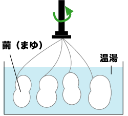 模式的に描くとこのよう繭を解し糸にします。 糸を造る。