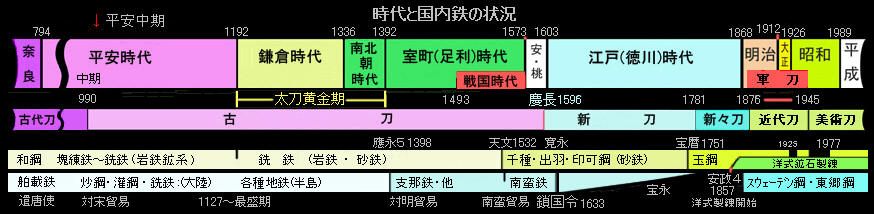 国産直刀の「剣」の時代を経て、関東以北で舞草刀が生まれ、奥羽戦争の経験から平安中期に湾曲した刀身の「太刀」が出現する。鎌倉時代の太刀黄金期を経て、室町時代の戦法変化で太刀は「打ち刀」に移行した。対明貿易で支那鉄が盛んに流入していた。室町時代後期※、千草・出羽(いづわ)の商業鋼が生まれる。同じ頃に南蛮鉄の輸入が始まった。