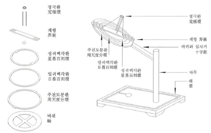 界衡: 모두 4개의 구멍이 있고 양끝에는 빈 곳이 있다. 4개의 구멍으로 실(명주실)이 통하는데 이 실은 계형 빈곳의 중앙을 가로질러 환의 눈금을 읽을 수 있게 한다. 양 끝에 귀가 있어 움직일 수 있게 하며 중앙의 좌우에는 정극환을 지지하는 작은 두 마리의 용이 끼워지는 구멍이 있다.