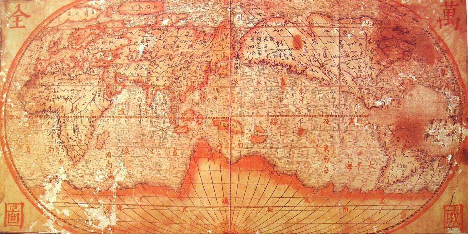 マテオリッチは、広東省に滞在していた1583年と1584年にそれぞれ”坤與全圖”と增補版 “輿地山海全圖”を、1600年には南京で”山海輿地全圖”、そして1602年には有名な”坤與萬國全圖”を制作するために、この世界地図はAbraham Ortelius の『世界の舞台』をベースにしながらも自分たちで新しく発見された東アジアの地域情報を追加したもので、世界地図製作の歴史の中で非常に重要な資料である。