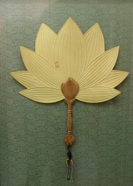 頭部分を曲げて趣もいかして力が強くしたのだ. このような曲頭扇には一番(回)だけ面を曲げた曲頭扇とこの中曲頭扇, シルゴブザングではなどがある. 麻曲も蓮葉では : 麻でソンミョンを蓮の花びら模様で作った曲頭扇だ. (絵 B)
