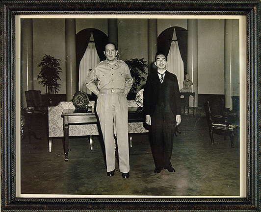 맥아더 장군을 맞아 차렷 자세로 서있는 왜왕 히로히토