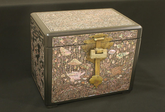 葡萄螺鈿衣裳箱とほぼ同様の器形・つくりを見せた箱で,蓋とその四側面には牡丹唐草を全体にあしらっている。ただ,文様は比較的遠慮気味にあつかわれており,黒漆の部分を多く残しているのが特徴的である。この様な手法はわが国の近世の螺鈿に影響を与えたようで,そのことはMOA美術館にある箱をみても明らかである。李朝螺鈿の独特の作風を見せた優品の一つである。