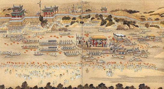 風楽が空を鳴らし帆の船が江を覆った。監司 は′樓船の高いところに座り′多くの首領も多集まり′祝宴が大幅に