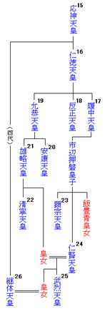 본래라면 황태자였던 木梨軽皇子가 允恭天皇의 다음의 천황이 될 예정이었다.그런데 , 木梨軽皇子가 여동생인 軽大娘皇女를 범했기 때문에 군신이 따르지 않게 되어, 남동생인 穴穂皇子의 평가가 높아졌다.木梨軽皇子는 穴穂皇子를 죽이려고 했지만 살해 계획은 실패해, 木梨軽皇子는 자살, 그 결과, 穴穂皇子가 즉위 해 安康天皇이 된다. 安康天皇이 즉위 한 후, 대왕가끼리에 의한 황위계승 분쟁이 발생한다.이것이, 마치 야쿠자의 항쟁과 같은 살인의 연속이었다.우선 安康天皇이, 仁徳天皇의 아들・大日下王을 살해.만세일계를 주장하는「일본 서기」에 의하면, 允恭天皇은 仁徳天皇의 아들이 되고 있기 때문에, 安康天皇에게 있어서 인덕은 조부에 해당한다.그러나, 실제는 인덕과 윤공은 혈연 관계가 없고, 각각이 당시의 유력 대왕가였다.