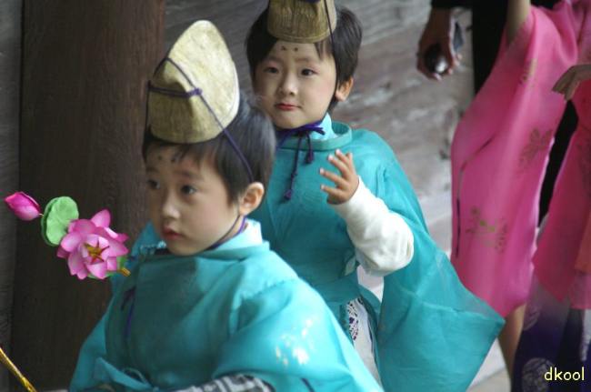 稚児たちの準備です。化粧をして、衣装に着替えます。檀家のおばさんたちが、ボランティアで、お手伝いをしています。毎年の事なので手馴れたものです。