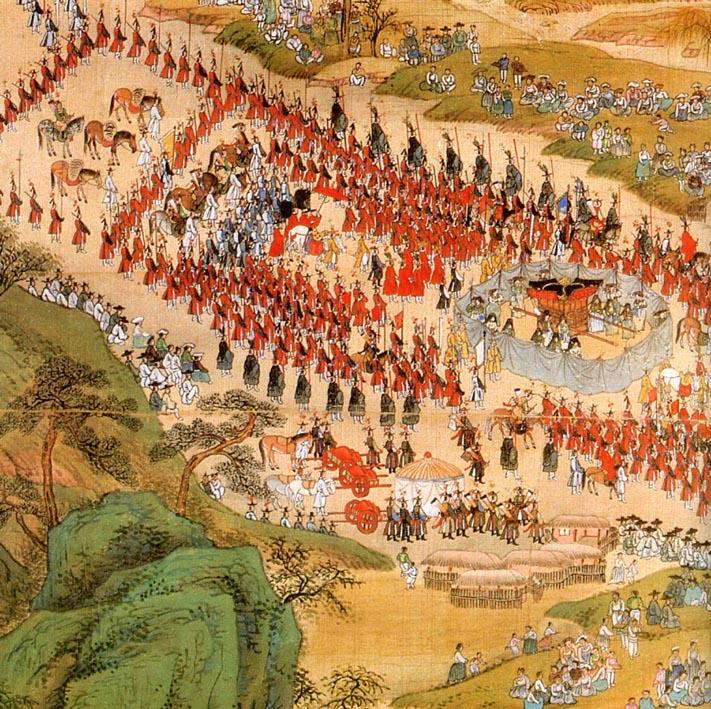 국왕의 행차를 서서 바라 보거나 앉아서 구경하고 있다.