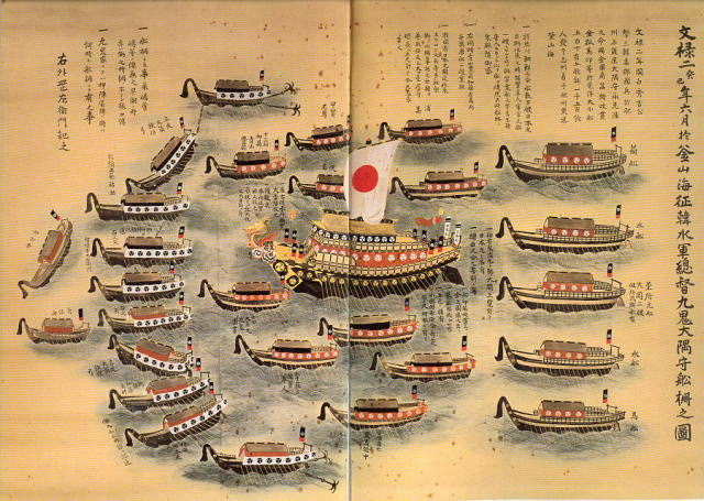 1582 년의 혼노지의 변으로 오다 노부나가(1534-82)가 넘어진 후, 야마토국의 지배자가 된 토요토미 히데요시(1536-98)는, 다음의 목표로서「명」의 정복을 결의.충분한 해군력을 가지지 않았던 히데요시는, 1586년부터 2000척의 배의 건조를 시작했다.1587년에는 조선군의 힘을 측정하기 위해, 26척으로 구성된 습격 부대를 조선 남해안에 파견해, 조선군은 문제가 되지 않는다고 결론 짓고 있었습니다만, 한반도를 통해 육로로「명」에 침공할 계획을 세웠고 그것을 위해 조선을 야마토국에 복속시키는 교섭을 측근의 고니시유키나가(?-1600)와 대마도의 宗義智(1568-1615)에 명령.당시 , 「명」의 책봉 체제하에 있던 조선과의 교섭이 결렬하면, 1591/8월에 히데요시는「당방문」을 선언해, 제일 대로부터 9번대까지의 9 군단 총원 15만 8000명 정도의 한국 출병의 군세를 편성해, 오사카성으로부터 나고야성(현・사가현 카라츠시 친제이쵸 나고야)의 전선 사령부에 음력4/25에 출했다.