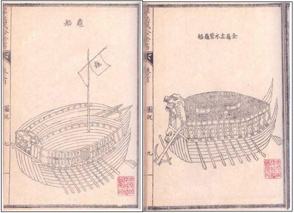 “臣嘗慮島夷之變 別制龜船 前設龍頭 口放大砲 背植鐵尖 內能窺外 外不能窺內雖賊船數百之中 可以突入放砲”