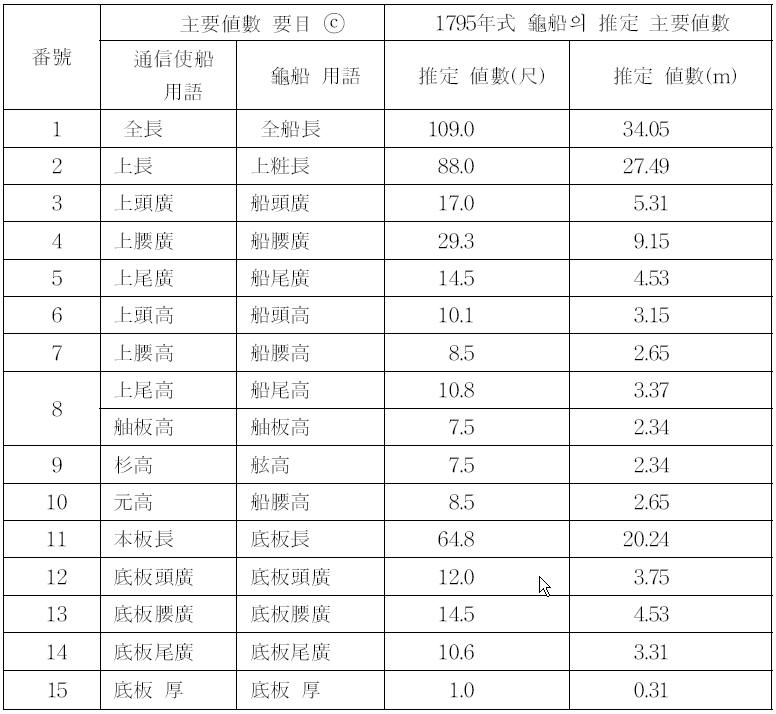 龜船의 推定 主要値數表