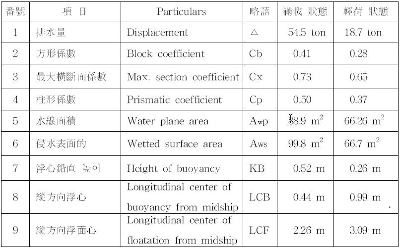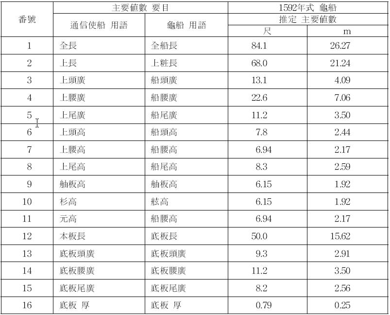1592年式 龜船의 推定 主要値數表