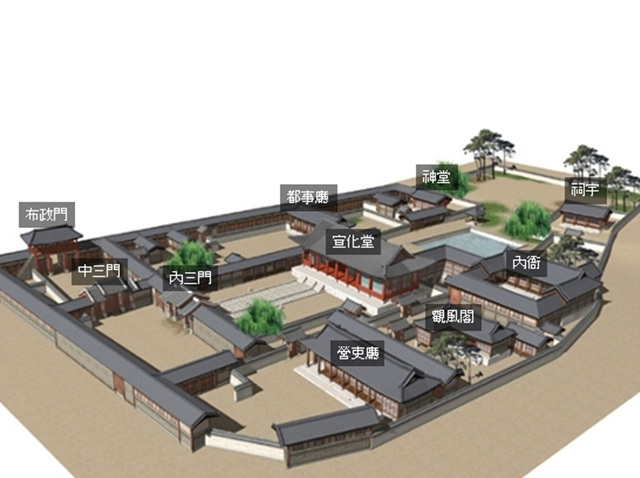 競技(景気)監営の構造は西の方に門戸でポゾングムン(布政門)があって 2個の門をもっとパスすれば功績な業務を処理する中心建物である宣化堂(宣化堂)があった. 観さつ使の 執務室であるグァンプングガック(観風閣), 補佐する役人たちが勤めるヤングイチォング(営吏庁), 宿所と同時に暮しを担当する出して(内衙), その外の祭祀施設及び休息空間があった. 競技(景気)監営は他の道義監営に比べて比較的簡単な配置構成を見せているのに これはソウルの中にあって他の 道とは差別性があって 役場への性格が弱かったからだ.