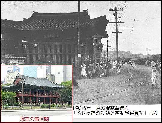 그러자(면) 아래의 사진의 우단에 있는 기와나무의 건물은 「보신각」은 아닐까.