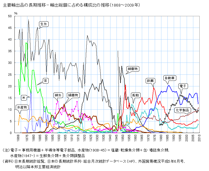 米や水産物も重要輸出品目になっていたのは意外だった。グラフを見ると1890-1895年ごろから農産物から軽工業(繊維業)に移行している。