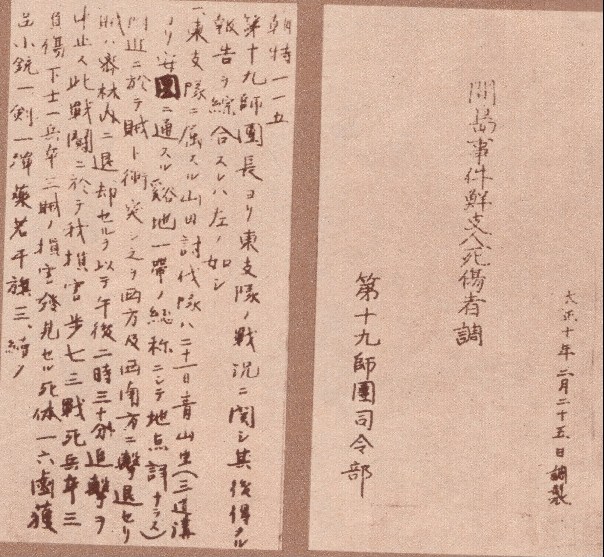 19 사단 군사령부 문서10월 21일, 삼도구 청산리 마을 부근에서 교전, 시체 16을 유기 패주.일본군사망자 3명, 부상 4명, 10월 22일, 이도구 어랑촌으로 교전, 도주, 일본군사망자 1명, 말3마리 이외 전투는 없음.