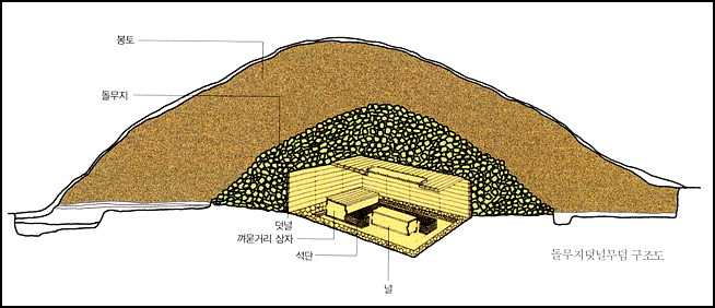 百済の墓構造は煙瓦や石で部屋を作って横で入口を作って大きな岩や煙瓦, 石を積んで入口を阻むのにこんな構造は入口の位置が分かって障害物さえとり除けばすぐ入ることができるから盗掘の被害を被りやすかった. 6世紀新羅が律令を頒布して先進文明を積極的に受け入れながら 積石木槨墓という新羅伝統の墓構造でこんな 石室墓が主類を占めるようになる.