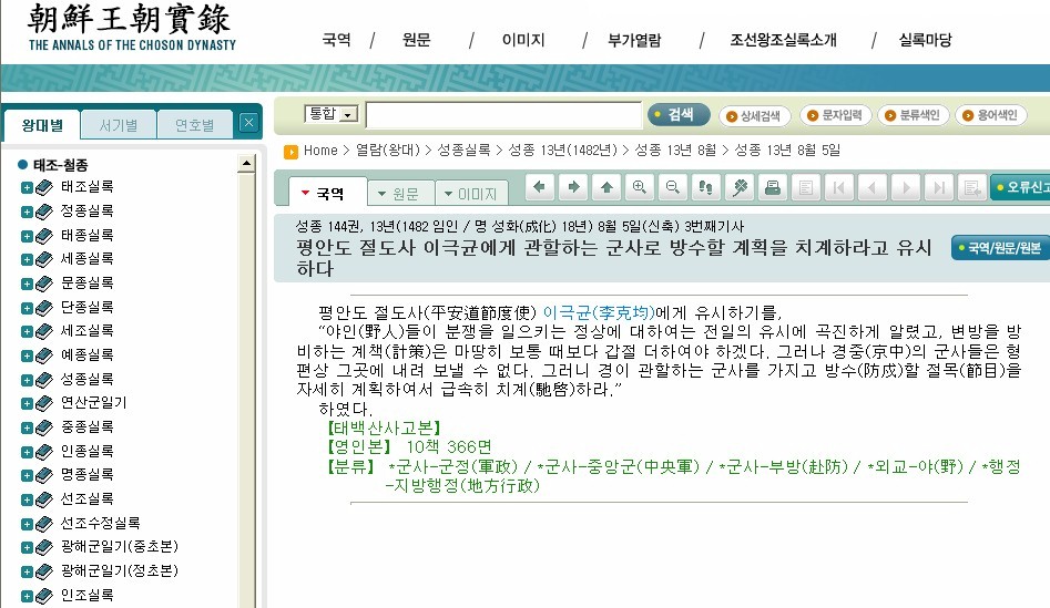 조선왕조 실록은 이미 한국어, 한자 원문, 이미지로 各 국왕別, 매년, 매월, 매일, topic 기준으로 온라인 열람이 가능하다.