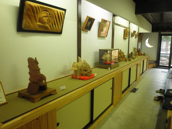 色んな木彫りの作品が展示されているが、全部何十万円もする。