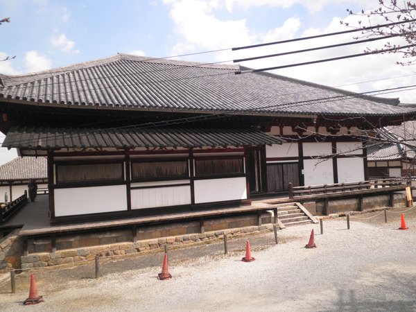 写真右端に「鐘楼」(国宝・7世紀後半の梵鐘を吊るす)が見える。