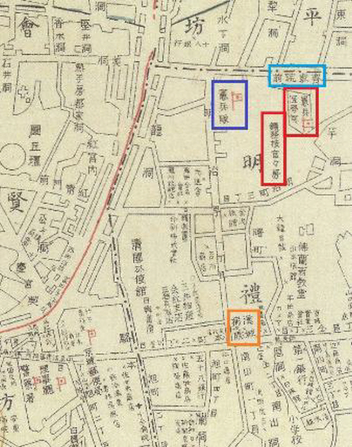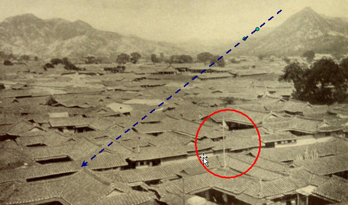 旗竿の位置は地図の上で見る時洪専門前近くで考えられる. 少し変に考えられることは 3階建物である円丘壇が写真で確認にならないというのだ. 1897年以前の写真だろう? 円丘壇南側に東西に付いた道があるのにこの途中洪専門前(紅箭門前)と言う(のは)名前が付けられている. 漢字である洪専門は我らの方法言葉では桟が付けてある赤門だ. 昔に御陵, 畝, 宮殿などの正面に建てた赤い漆を一門を称えて洪専門あるいは桟が付けてある赤門と言った.