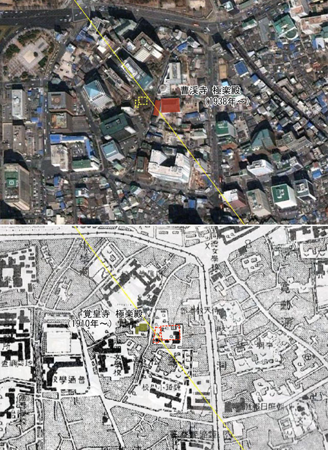 現・曹渓寺の極楽殿の棟は衛星画像上で見る限り、大雄殿より北側へは延びない。