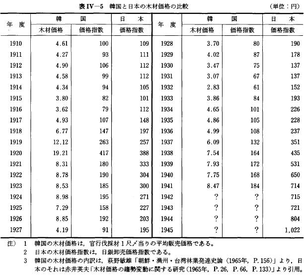 일본의 목재 가격의 추이를 보면, 겉(표) IV-5에 보도록(듯이), 이전의 일본의 목재 가격은 약180% 상승했지만, 한국의 그것은 반대로 약70%로 저하했다.이러한 목재 가격 하락의 원인으로서는,
