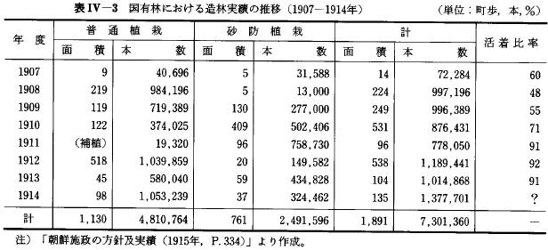 조림 면적 42, 000정보의 신식, 보식, 무육, 정지를, 또 미입목지, 산천의 조림 계획은 33, 100정보에 신식, 보식, 무육을, 그리고 제1, 11령급의 어린 연령숲은 27, 400정보의 성림무육을 이루어, 합계 102, 500정보의 조림 계획을 실시하려고 하는 것(이었)였지만, 그 실적은 전체적으로46%의 46, 754정보에 머무른 35).덧붙여 당시의 인건비의 상승과 재정의 악화등을 고려하면, 국유림의 조림 사업은 극히 부진하였다고 추측된다.